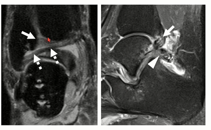 MRI상 ligament의 signal이 변화(좌측), thickening(우측)으로 관찰될 수 있다.