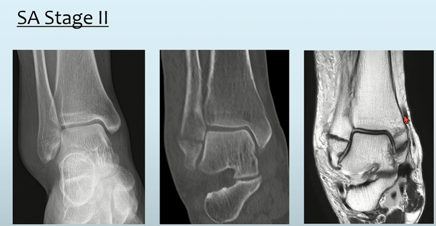 - Stage2: Talus가 Medial malleolus를 건드려서 vertical한 양상의 골절을 보임
