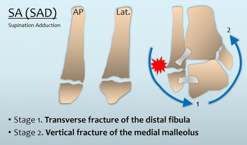 SA type = distal fibula의 transverse한 골절 양상( Danis-Weber classification상 A ) + MM의 vertical한 골절