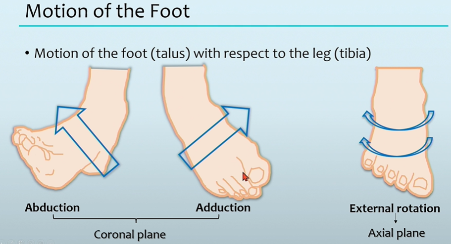 - 작용하는 외력: Tibia를 기준으로 Talus가 어떻게 움직이는지를 의미. Abduction / Adduction/ External rotation이 있음.