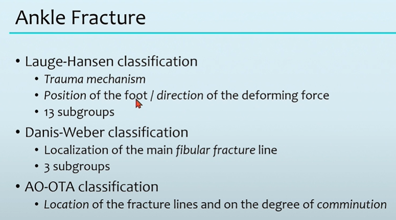 가장 많이 사용하는 분류법은 Lauge-Hansen classification.