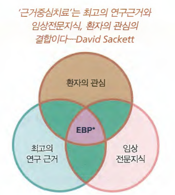 - Evidence – based practice = 현대 사회의 의료이자 바람직한 형태의 의료, 고품질 연구 인용, 표준화된 치료, 환자의 의사를 고려하는 치료.