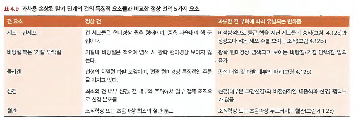 1) 콜라겐의 불규칙 배열, 2) 기질 단백질 증가, 3) 신생 혈관 비정상 증가, 4) 근섬유 모세포의 증가, 5) 신경 증식, 6) 비정상 건세포(수가 적고, 둥근 형태), 정상은 원추형태임.