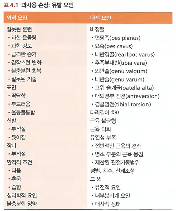 - 외적 요인: 잘못된 훈련, 표면, 신발, 장비, 환경적 조건, 심리학적 요인, 불충분한 영양