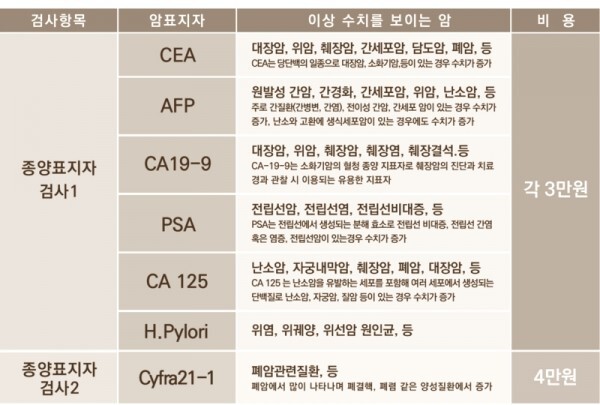 아래 표에서 볼 수 있듯이, 종양 표지자는 여러 가지가 존재합니다