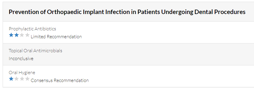 2. We are unable to recommend for or against the use of topical oral antimicrobials in patients with prosthetic joint implants or other orthopaedic implants undergoing dental procedures.