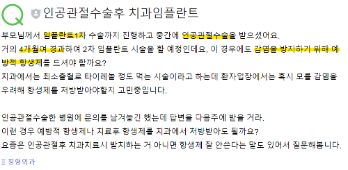 : 인공관절을 받은 부모님이 치과 진료(임플란트)를 하려고 하는데 항생제를 미리 복용을 해야할지 여쭤보셨습니다.