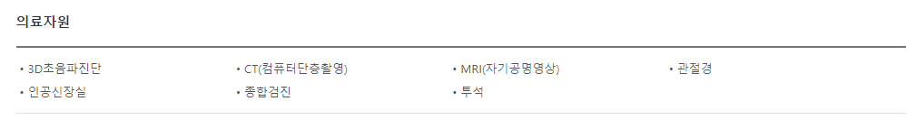 기본적인 위치, 전화 번호, 의료 기관 평가 점수, 가능한 진료 과목 및 검사 항목을 포함하려고 합니다.