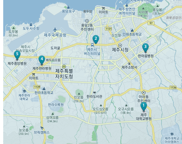 5개의 병원이 제주 시내에 위치하고 있습니다.