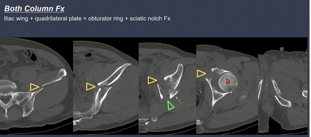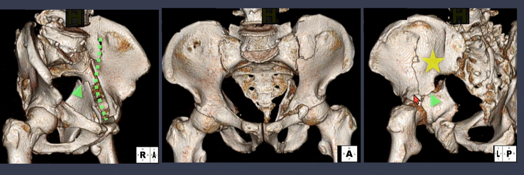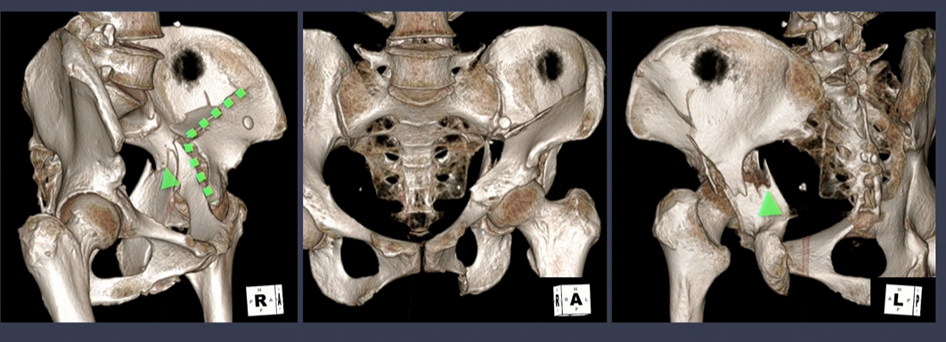 iliac wing쪽 골절선(녹색 점선)에 더해서, sciatic notch로 이어지는 골절선(녹색 화살표)을 확인.