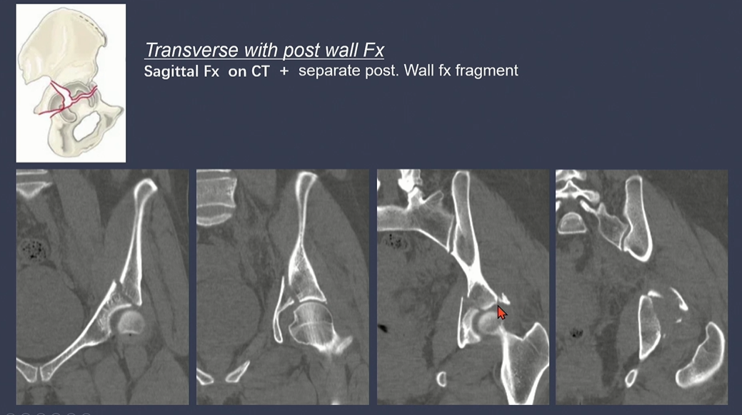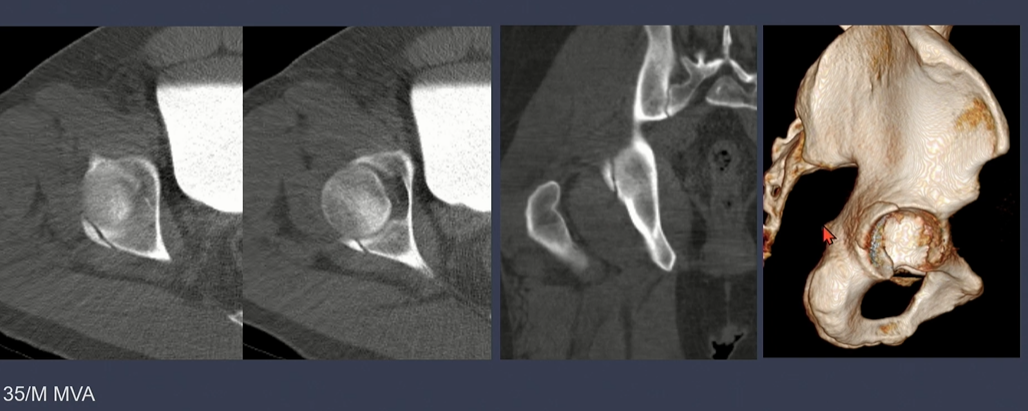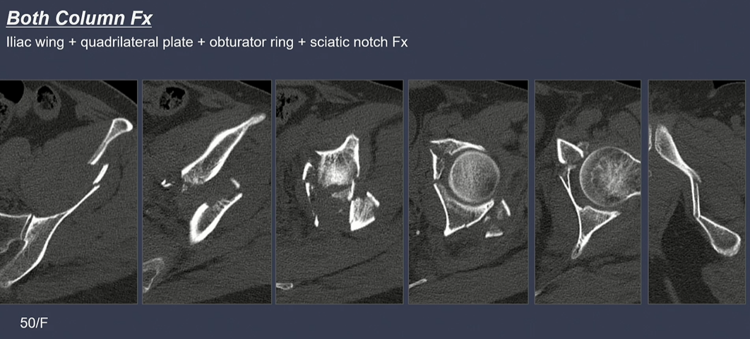 CT상 골절선 확인. 가장 좌측 iliac wing, 중간 사진은 Quadrilateral plate에 골절선이 있음.
