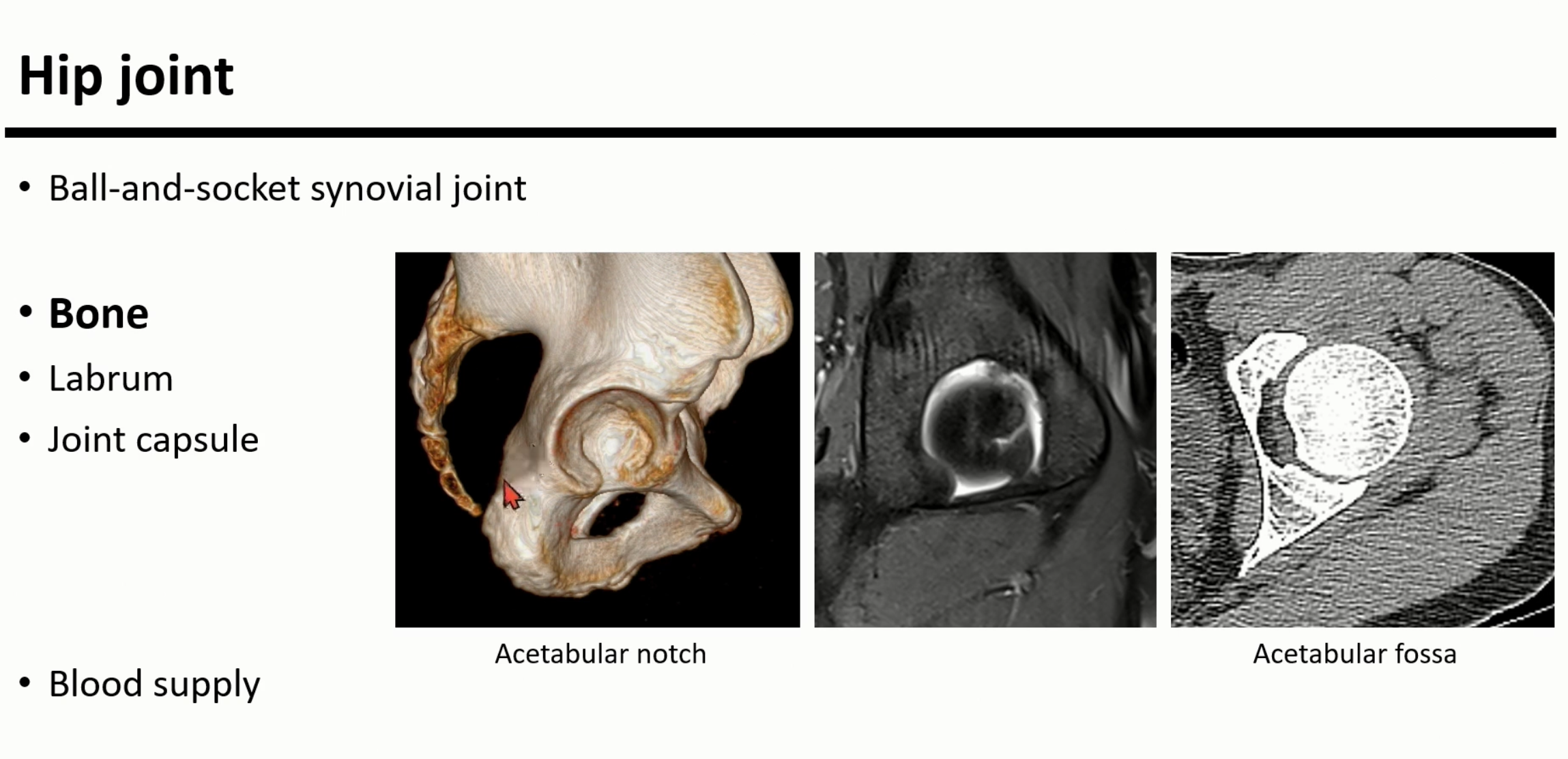 acatabulum의 관절 중 cartileage가 아닌 fat으로 구성된 acetabular fossa가 존재함.