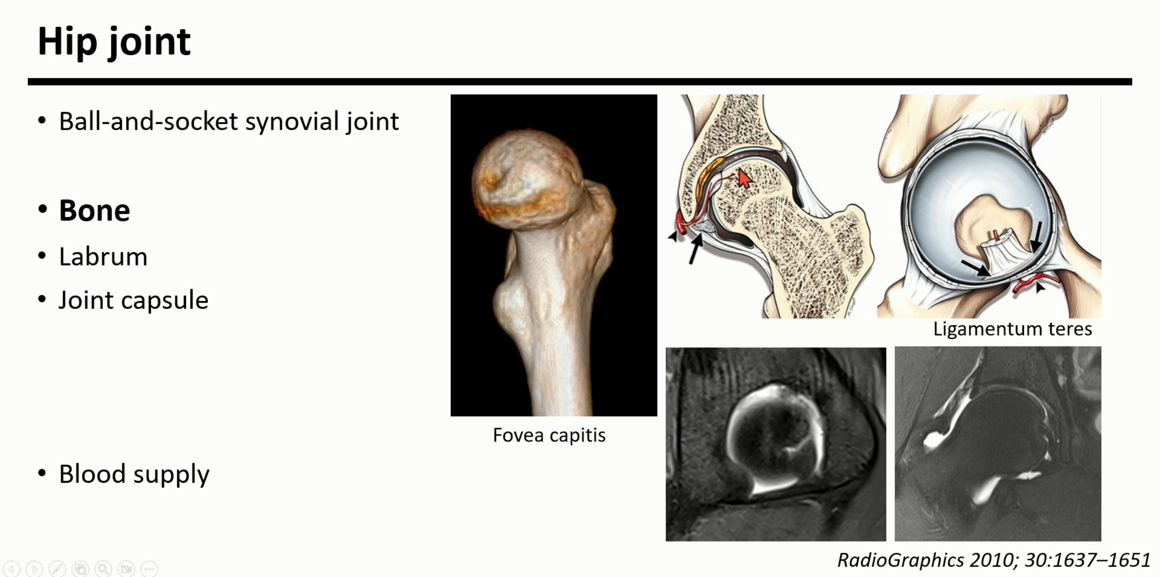 Ligamentum teres는 transverse ligament부터 시작해서, Fovea capitis를 연결하는 구조이며, obturator artery의 분지를 포함함. MRI상 hypo-intense한 cord-like structure이나, fovea capitis에 부착되는 부위에서는 정상에서도 다소 high signal을 보일 수 있다.