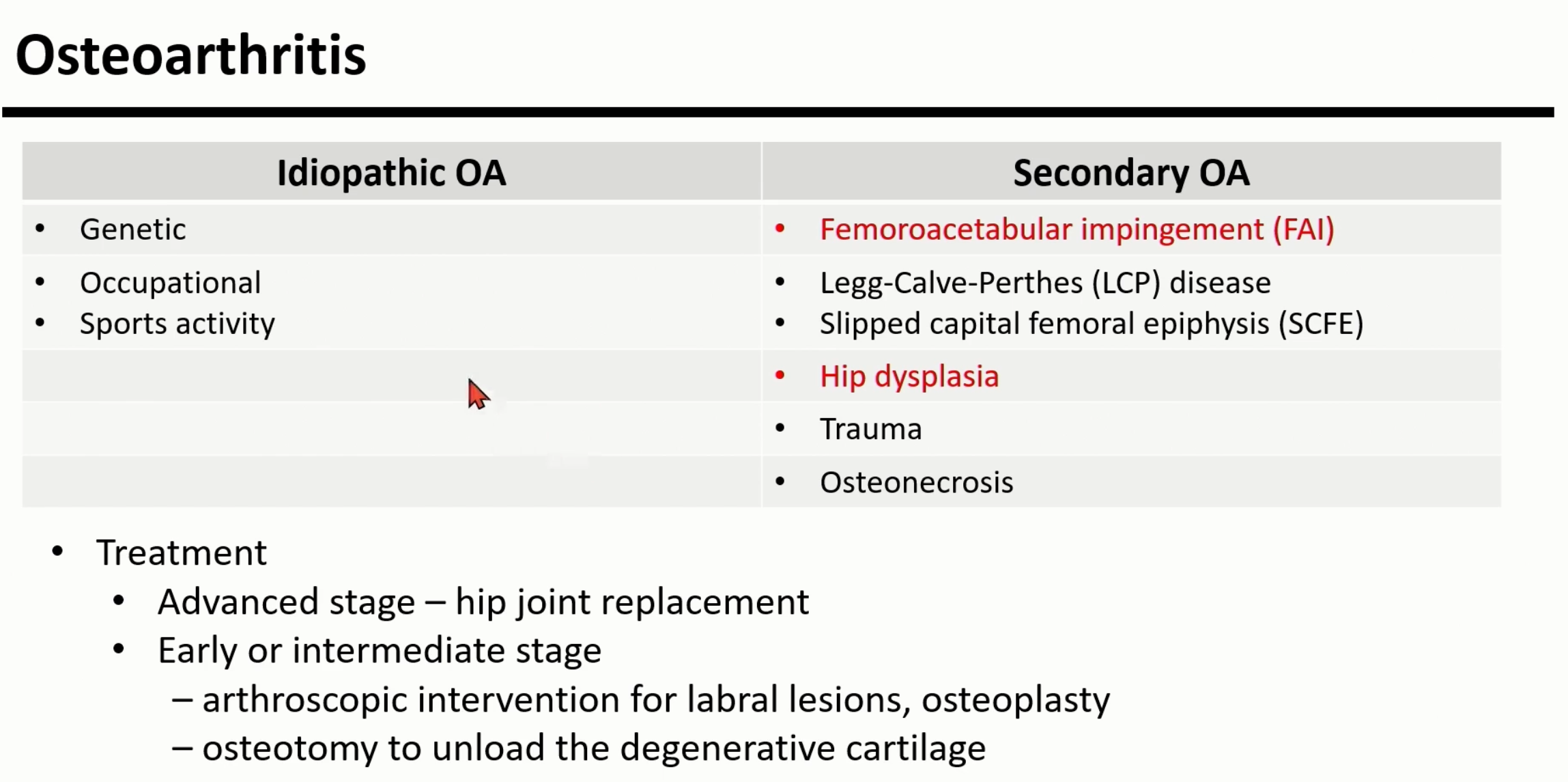 - Secondary OA: 2차성 골관절염, 어떠한 이유로 인해 발생한 골관절염 (이유로는 충돌 증후군, LCP 병, SCFE, 고관절 이형성증, 외상, 괴사 등이 있습니다)