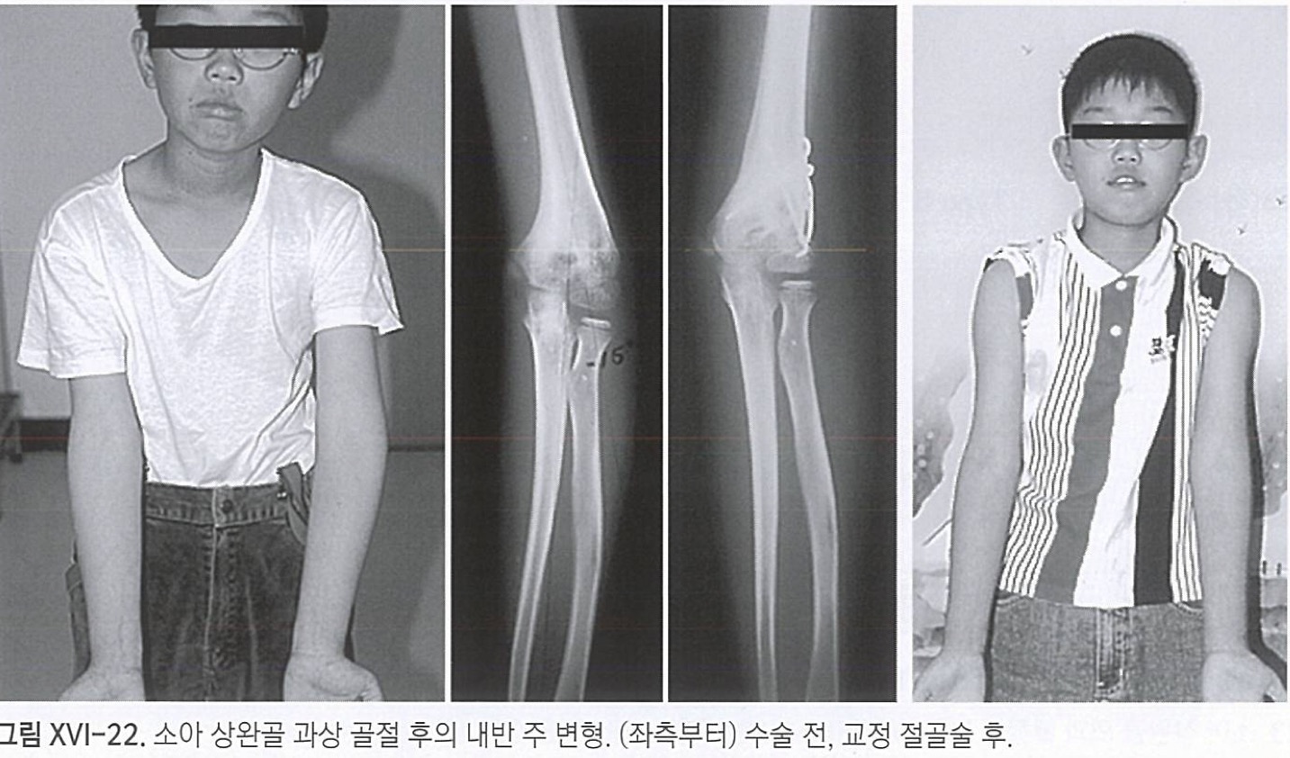 골절의 치료 과정에서 각의 변형이 이뤄져서 팔이 끝이 안으로 향하는 내반 변형이 가장 흔합니다.