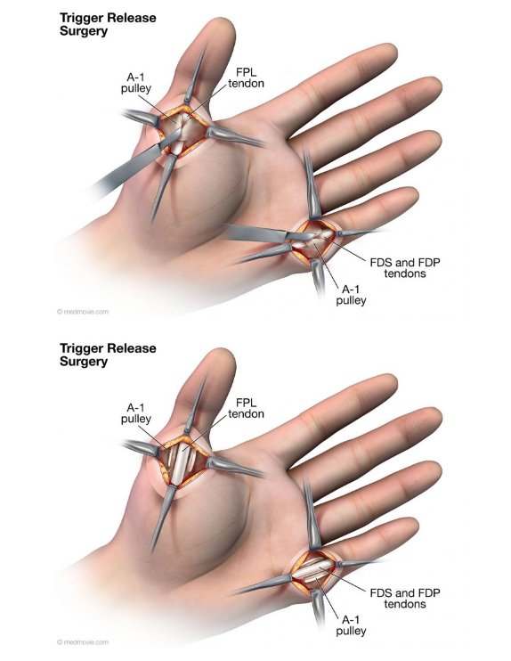 첫번째 그림에서 처럼, A-1 pulley(활차)를 칼로 잘라주는 것이 수술입니다.