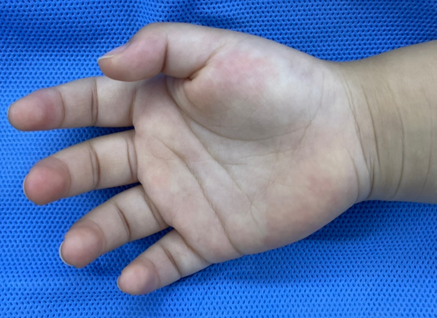 성인과는 다르게, 엄지 손가락 끝마디가 구부러진 상태가 유지되는 이상 자세가 가장 흔한 증상입니다.